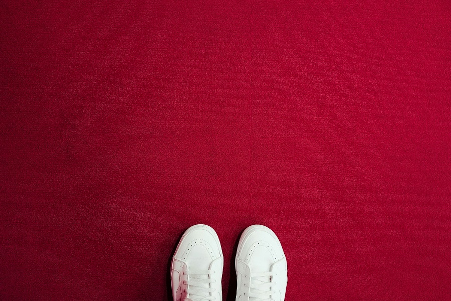 paire de chaussures blanches à lacets sur fond rouge pour illustrer les grandes étapes du DRP